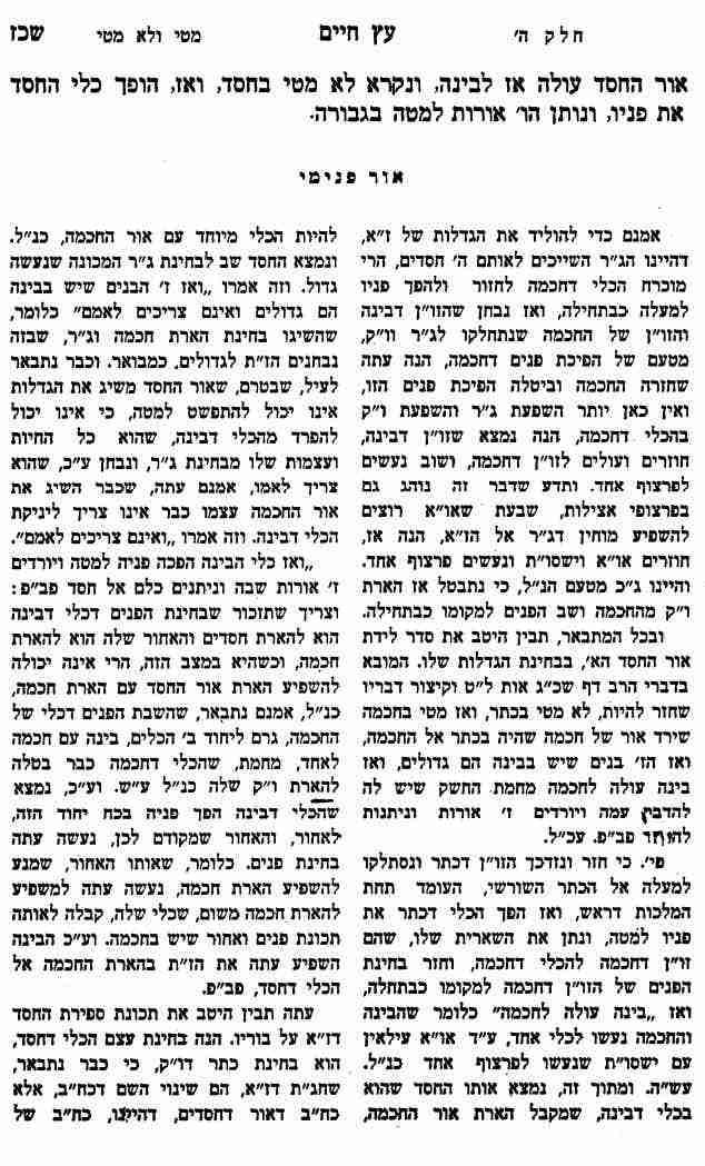 וזה אמרו "לכן אור החסד עולה אז להבינה" כי אחר שנעלם הג"ר מן אור החסד וחזר לקטנותו, הנה שוב נצרך לאמו הבינה, לינק משם הארת ג"ר דהכלי עכ"פ כבתחילה. וזה אמרו "ואז הופך כלי החסד את פניו ונותן הו' אורות למטה בגבורה" כי הפנים דכלי דחסד הוא להארת חכמה אחר שקבל הארת חכמה כנ"ל, והאחור שלו הוא להארת חסדים, כי בכ"מ שיש חכמה וחסדים במדרגה, נבחן החכמה לפנים והחסדים לאחורים, וע"כ נבחן האחור דחסד להארת חסדים. אמנם עתה שנעלם ממנו הארת חכמה, ואורו נעלם לכלי דבינה, נמצא, שהפך פניו למטה ונתן שארית האור שבו לכלי דגבורה ואז מטי בגבורה.