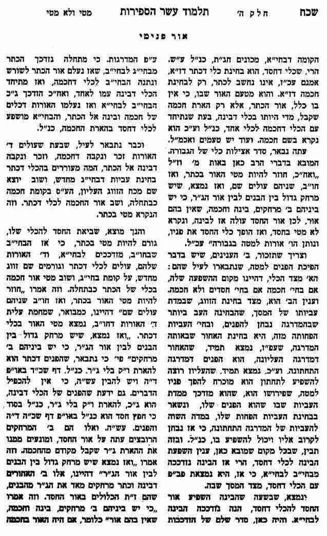 "ואז כלי הבינה הפכה פניה למטה ויורדים ז' אורות שבה וניתנים כלם אל חסד פב"פ: וצריך שתזכור שבחינת הפנים דכלי דבינה הוא להארת חסדים והאחור שלה הוא להארת חכמה, וכשהיא במצב הזה, הרי אינה יכולה להשפיע הארת אור החסד עם הארת חכמה, כנ"ל, אמנם נתבאר, שהשבת הפנים דכלי של החכמה, גרם ליחוד ב' הכלים, בינה עם חכמה לאחד, מחמת, שהכלי דחכמה כבר בטלה להארת ו"ק שלה כנ"ל ע"ש. וע"כ, נמצא שהכלי דבינה הפך פניה בכח יחוד הזה, לאחור, והאחור שמקודם לכן, נעשה עתה בחינת פנים. כלומר, שאותו האחור, שמנע להשפיע הארת חכמה, נעשה עתה למשפיע להארת חכמה משום, שכלי שלה, קבלה לאותה תכונת פנים ואחור שיש בחכמה. וע"כ הבינה השפיע עתה את הז"ת בהארת החכמה אל הכלי דחסד, פב"פ.