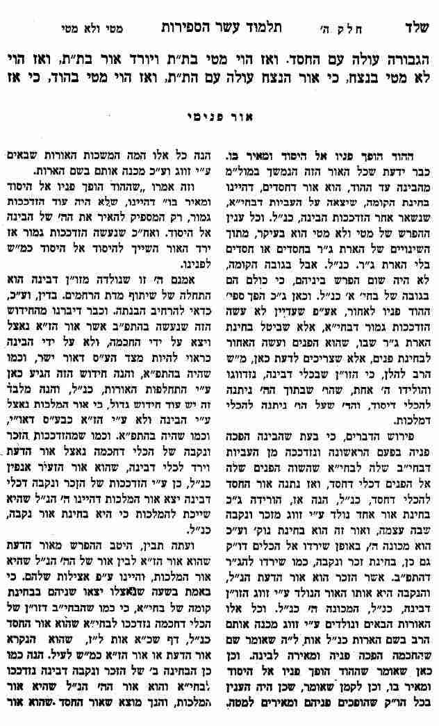 ועתה מצאנו הדרך להבין את הספירת ההוד של הז"א ממקורו. ותדע, שספירה זו הוא הקוטב, שכל התיקונים תלוים ומתגלגלים עליה. והנה הכלי שלה היא בחינה חמישית האחרונה של ה' הבחי' כח"ב ז"א ומלכות, דהיינו כלי מלכות המקורית. כי הד' החסדים הקודמים, הם כנגד כח"ב ז"א. ונמצא חסד חמישי דהיינו ההוד שהוא כנגד המלכות. וכבר ידעת שכל אותם הכלים דהתפ"ב, הם הכלים של התפ"א, שנתרוקנו מן אורותיהם, כנ"ל, ונמצא שהכלי דהוד הוא הבחי"ד דהתפ"א שנתרוקנה מאורה ולא השאירה אחריה שום רשימו. כנ"ל, בחלק ד' בדברי הרב (פ"ב אות ו') אמנם האור של ההוד, אינו אור המלכות, אלא אור הז"א, דהיינו מה שהגיע אליה משארית הנצח, בעת שהוא מחובר באור דהארת ג"ר של הת"ת. ולא עוד אלא שהוא אור היותר חשוב מבין הספירות של נהי"מ, שמצד האורות הוא בחינת הג"ר של ז"א ולא ז"א עצמו כנ"ל. והרי הוא חשוב יותר מנצח, כי נצח הוא מבחינת אחורים וו"ק של אור הת"ת, אבל ההוד, הוא מבחינת הפנים של הת"ת, כנ"ל. שיש לו הארת ג"ר מהת"ת. ולפיכך ההוד נקרא בשם חסד החמישי, להיותו בחינת הארת ג"ר שישנם בנהי"מ, כמבואר. ואע"פ שמצד הכלי הוא בחי"ד, שהוא דין היותר גדול שבהע"ס, אבל העיקר הוא האור שבו כמובן. והנה האור שלו הוא ממותק עתה ביותר, דהיינו מהארת ג"ר שבת"ת. והבן היטב.