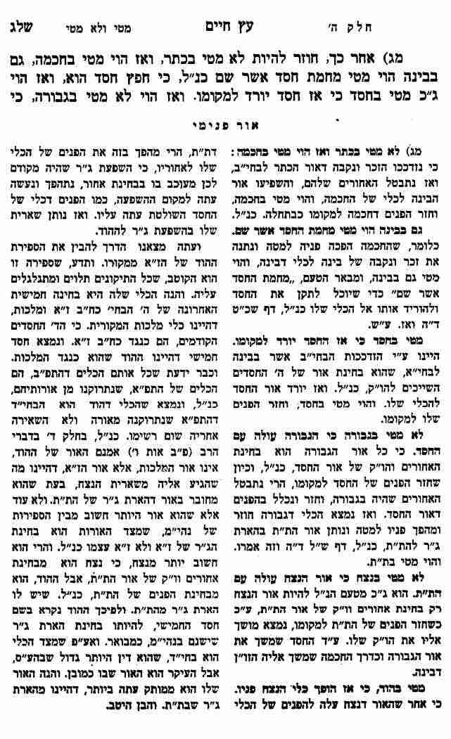 מטי בהוד, כי אז הופך כלי הנצח פניו. כי אחר שהאור דנצח עלה להפנים של הכלי דת"ת, הרי מהפך בזה את הפנים של הכלי שלו לאחוריו, כי השפעת ג"ר שהיה מקודם לכן מעוכב בו בבחינת אחור, נתהפך ונעשה עתה למקום ההשפעה, כמו הפנים דכלי של החסד השולטת עתה עליו. ואז נותן שארית שלו בהשפעת ג"ר לההוד.
