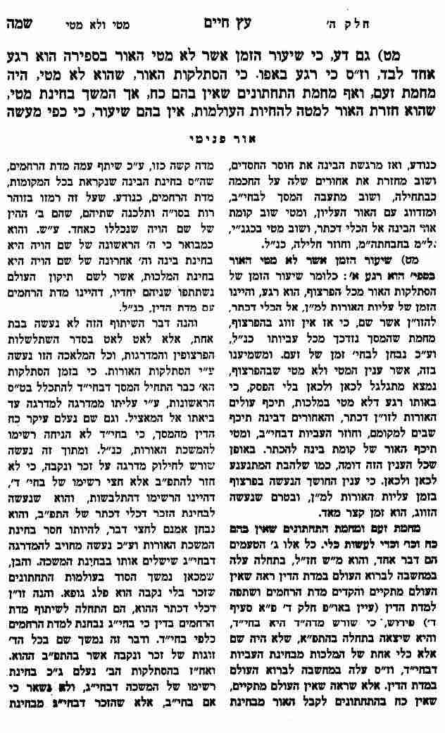 מט) גם דע, כי שיעור הזמן אשר לא מטי האור בספירה הוא רגע אחד לבד, וז"ס כי רגע באפו. כי הסתלקות האור, שהוא לא מטי, היה מחמת זעם, ואף מחמת התחתונים שאין בהם כח, אך המשך בחינת מטי, שהוא חזרת האור למטה להחיות העולמות, אין בהם שיעור, כי כפי מעשה תחתונים כך יהיה. וזהו חיים ברצונו, כפי הרצון שיהיה אז, ר"ל כפי מעשה בני אדם, כך ימשך זמן החיים ההם. ואמנם לעיל ביארנו, כי הסתלקות הא' של האורות היה כדי לעשות כלי. והנה, כאשר חזרו האורות פעם ב', בהתפשטות ב', הנה היו חוזרים הכלים להתבטל כעת הראשון, לכן הוצרך שישאר אור הראשון שבכולם, שהוא אור הכתר, למעלה, ולא יכנוס בכלים אלו, ולא באו רק ט' אורות לבדם על סדר זה, אור החכמה בכלי של הכתר, ואור בינה בכלי של חכמה, וכו' עד"ז. עד שנמצא, שאור מלכות נכנס בכלי יסוד. ועתה, אחר שלא חזר בכלי אותו אור הראשון הנוגע אליו, אשר תחלה נסתלק ממנו, אלא הגיע לו אור אחר זולתו קטן ממנו, ע"כ נשארו הכלים בבחי' כלים ולא חזרו להיות אורות כבראשונה. והנה כאשר התחילו האורות לכנוס בכלים, אז נכנסו הט' אורות בכתר, וזה נקרא מטי בכתר כנ"ל, ואחר כך נסתלק אור המגיע לכתר, שהוא אור החכמה, וזה נקרא לא מטי כנ"ל, ואין להאריך בזה, כי כבר הארכנו לעיל בחי' מטי ולא מטי די ספוקו. ואמנם, טעם למה עתה נכנסו כל הט' אורות יחד בכלי הכתר, משא"כ בהתפשטות א', כי נכנסו א' לא' כנ"ל, שנכנס אור המלכות בכלי של כתר, ואח"כ נדחה אור הזה למטה במקום החכמה, ואח"כ נכנס אור היסוד בכתר, וכן עד"ז, עד שנכנסו כל י' אורות כשיעור הי' כלים, הטעם הוא מובן עם הנ"ל, כי מתחלה שהיה אור הכתר עמהם, וגם כולם היו מאירים מצדו, לכן לא היה כח בשום כלי מהם לקבל בתוכו, רק אור א' לבד, אבל עתה שאור הכתר אינו נכנס עתה תוך הכלי, והוא נשאר למעלה והפך אחוריו למטה, כמ"ש בע"ה, לכן עתה יש כח ליכנס כל האורות ביחד תוך כלי א', כי כל הט' אורות הנכנסים עתה בכתר, הם קטנים מן אור הכתר הראשון, ויש כח לקבלם, וכן כשנכנסו כל הח' אורות בתוך כלי דחכמה, יש בה כח לקבלם, כי כולם קטנים מאור החכמה, ועד"ז בכולם.
