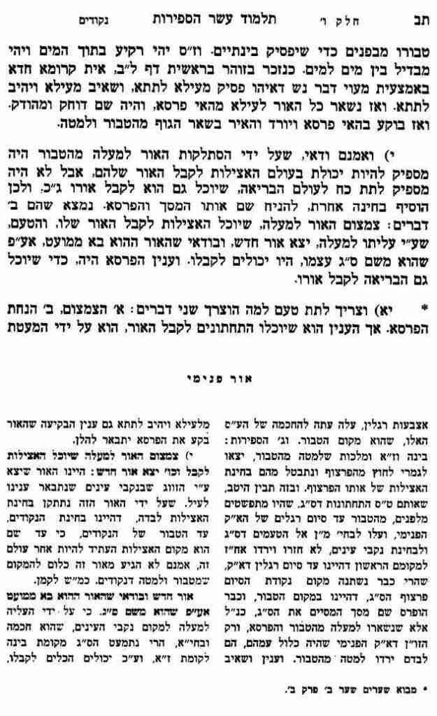 * ט) והנה אחר שצמצם עצמו, הניח חד פרסא באמצע גופו במקום טבורו מבפנים כדי שיפסיק בינתיים. וז"ס יהי רקיע בתוך המים ויהי מבדיל בין מים למים. כנזכר בזוהר בראשית דף ל"ב, אית קרומא חדא באמצעית מעוי דבר נש דאיהו פסיק מעילא לתתא, ושאיב מעילא ויהיב לתתא. ואז נשאר כל האור לעילא מהאי פרסא, והיה שם דוחק ומהודק. ואז בוקע בהאי פרסא ויורד והאיר בשאר הגוף מהטבור ולמטה.