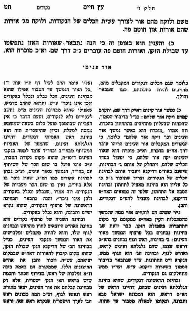 כ) נמשך אור עינים דא"ק דרך שם, יתערב עמהם ויקח אור שלהם: כנ"ל בדיבור הסמוך, שהכוחות שבעליון מתחיבים בהתחתון בהכרח. וזה אמרו "מוכרח הוא כאשר נמשך אור העינים וכו' ויקח אור שלהם" כלומר, כי הנקודים המקבלים אור העינים הריהו עובר דרך אח"פ בהכרח, וא"כ מוכרח הוא שאור העינים יקח אור שלהם, כי יפעול בסדר הכלים שלהם, ויתחלק על אותם ג' הבחינות, שישנם באח"פ דדיקנא ויעביר אותם לבחינת הכלים של הנקודים. וצריך שתזכור ג"כ כי כל עליון הוא בחינת מאציל לתחתון ובחינת הסבה אל התחתון, שלפי זה נמצאים האח"פ דדיקנא, לבחינת מאציל להע"ס דנקודים. והבן.