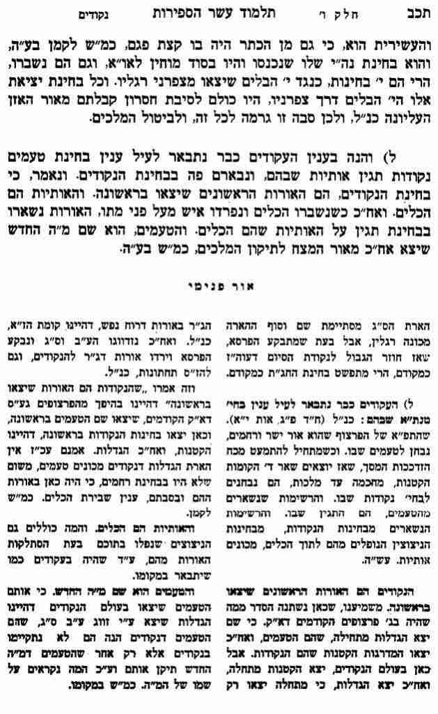 וזה אמרו "שהנקודות הם האורות שיצאו בראשונה" דהיינו בהיפך מהפרצופים גע"ס דא"ק הקודמים, שיצאו שם הטעמים בראשונה, וכאן יצאו בחינות הנקודות בראשונה, דהיינו הקטנות, ואח"כ הגדלות. אמנם עכ"ז אין הארת הגדלות דנקודים מכונים טעמים, משום שלא היו בבחינת רחמים, כי היה כאן באורות ההם ובסבתם, ענין שבירת הכלים. כמ"ש לקמן.