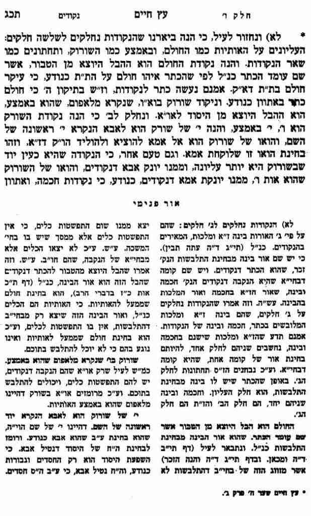 * לא) ונחזור לעיל, כי הנה ביארנו שהנקודות נחלקים לשלשה חלקים: העליונים על האותיות כמו החולם, ובאמצע כמו השורוק, ותחתונים כמו שאר הנקודות. והנה נקודת החולם הוא ההבל היוצא מן הטבור, אשר שם עומד הכתר כנ"ל לפי שהכתר איהו חולם על הת"ת כנודע, כי עיקר חולם בת"ת דא"ק. אמנם נעשה כתר לנקודות, וז"ש בתיקון ה' כי חולם כתר באתוון כנודע. וניקוד שורוק בוא"ו, שנקרא מלאפום, שהוא באמצע, הוא ההבל היוצא מן היסוד לאו"א. ונחלק לב' כי הנה נקודת השורק הוא ו', י' באמצע, והנה י' של שורק הוא לאבא הנקרא י' ראשונה של השם, והואו של שורוק הוא אל אמא להוציא ולהוליד הו"ק דז"א, וזהו בחינת הואו זו שלוקחת אמא. וגם טעם אחר, כי הנקודה שהיא כעין יוד שבשורוק היא יותר עליונה, וממנו יונק אבא דנקודים, והואו של השורוק שהוא אות ו', ממנו יונקת אמא דנקודים, כנודע, כי נקודות חכמה, ואתוון בינה, וז' נקודות תחתונות, עם ג' בחינות, שהם: א', נה"י של הכתר, וב' אחורים דאו"א, הרי הם יוד אלו, שיצאו דרך צפורני הרגלים. ואין כוונתינו לומר, שאלו הם הנקודות עצמן, רק שמכל אלו הבלים יצא אור אל י' נקודות שיצאו דרך העין, כנ"ל, וזכור זה.