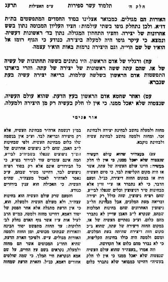 6. אדם הראשון נולד כאשר ראשו במקום זא דאצילות שמשם עלה עולם הבריאה, גרונו במקום מלכות דאצילות שלשם עלו ד' ראשונות דיצירה, גופו מתפשט בכל עולם הבריאה שלשם עלו ו' תחתונות דיצירה, וד' ראשונות דעשיה , ורגליו במקום ו' ראשונות דיצירה שלשם עלו ו' תחתונות דעשיה.
