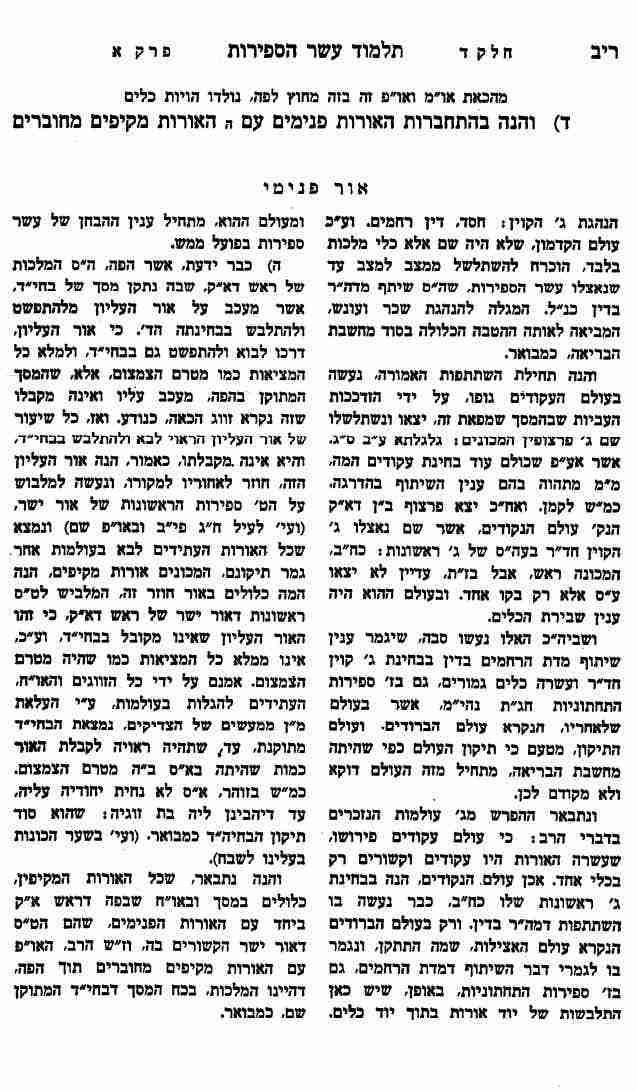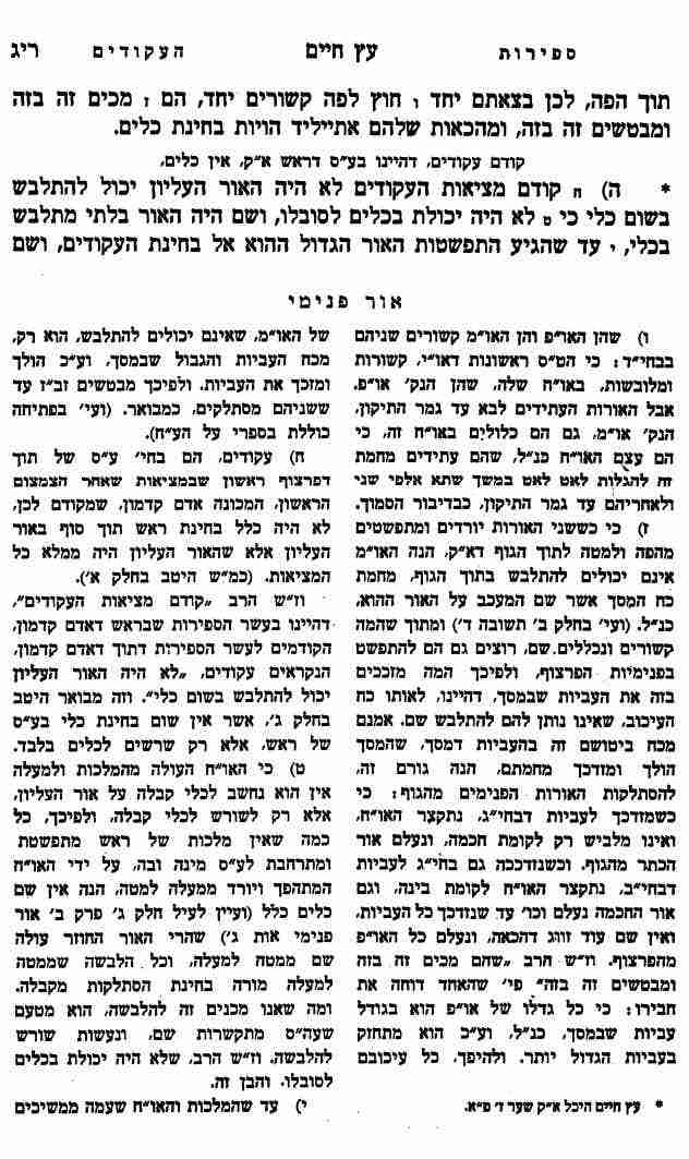 * ה) ח קודם מציאות העקודים לא היה האור העליון יכול להתלבש בשום כלי כי ט לא היה יכולת בכלים לסובלו, ושם היה האור בלתי מתלבש בכלי, י עד שהגיע התפשטות האור הגדול ההוא אל בחינת העקודים, ושם נעשה מציאות כלי אחד, אל האור הגדול ההוא, ואז כ התחיל האצילות להיות בו איזה מציאות הגבלת האור, ל מה שלא היה יכול להיות הדבר עד עתה.