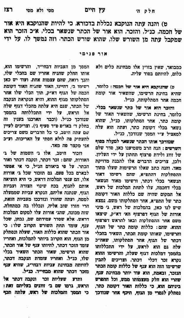 ט) והנה עתה הנוקבא נכללת בדכורא, כי להיות שהנוקבא היא אור של חכמה, כנ"ל, והזכר, הוא אור של הכתר שנשאר בכלי, א"כ הזכר הוא שמקבל עתה מן השורש שלו, שהוא שורש הכתר. וזה נמשך לו, על ידי שמזדכך אותו הכתר שנשאר למעלה בסוף השרשים, ועל ידי הארה העליונה, של שורש הכתר, הוא מזדכך מאד, ואז מאיר אור רב, בזה הזכר של הכתר, ואז נכללת הנקבה בזכר ומקבלת הארה ממנו, עד שנמצאים עתה ג' בחינות אלו שוים בהארתם, והם זכר ונקבה של כלי הכתר ואותו הכתר שעליהם, ואחר שהם שוים, יקבלו האור שלהם מצד שורש כתר עליון.
