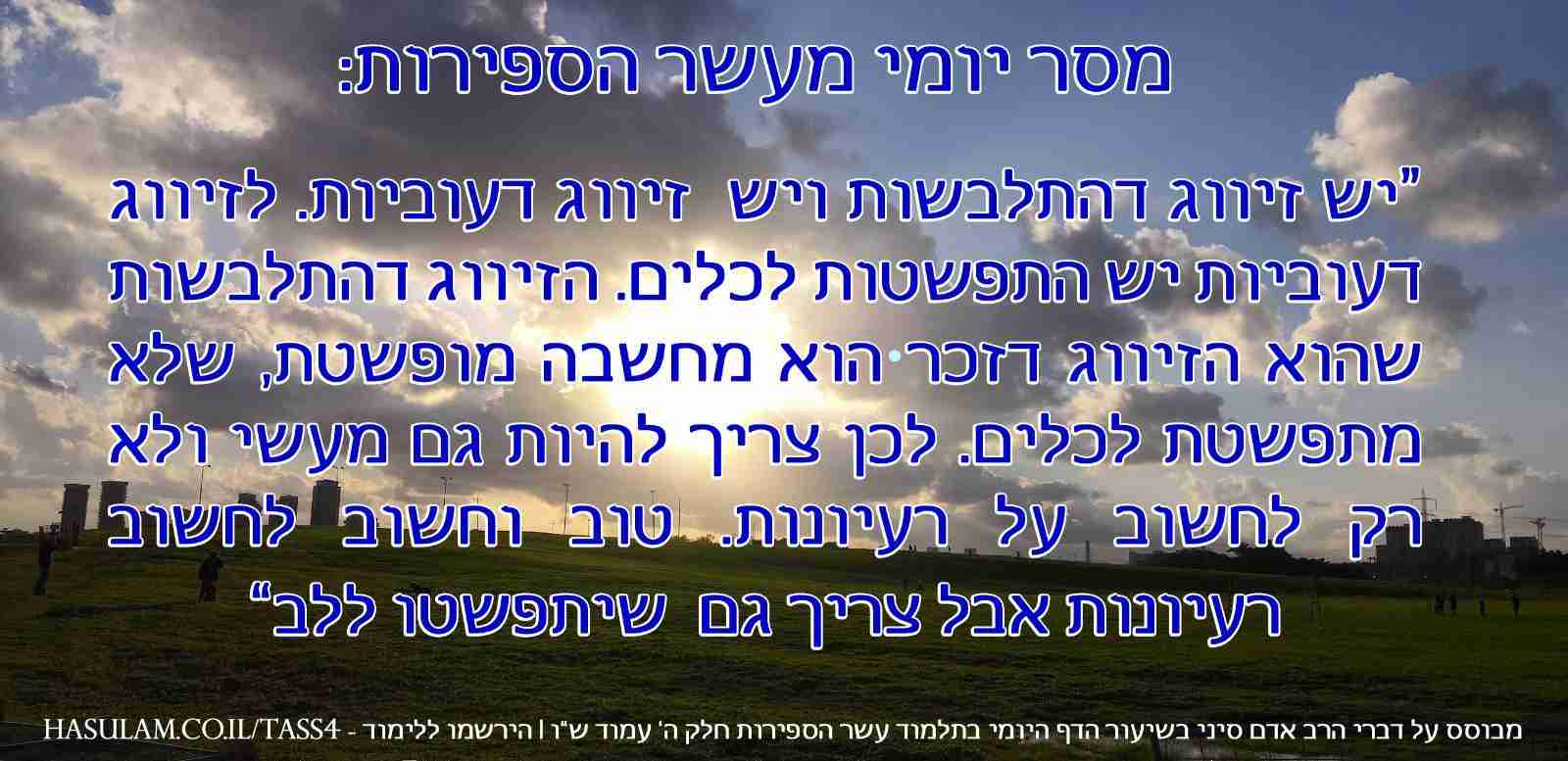 סיכום: למדנו בשיעור קודם, שחוץ מאשר זיווג דהתלבשות יש גם זיווג דעביות, לו יש התפשטות לכלים. לא כמו הזיווג דהתלבשות שהוא זיווג דזכר, שהוא מחשבה מופשטת שלא מתפשטת לכלים. ז"א צריך להיות מעשי ולא לחשוב רק על רעיונות.