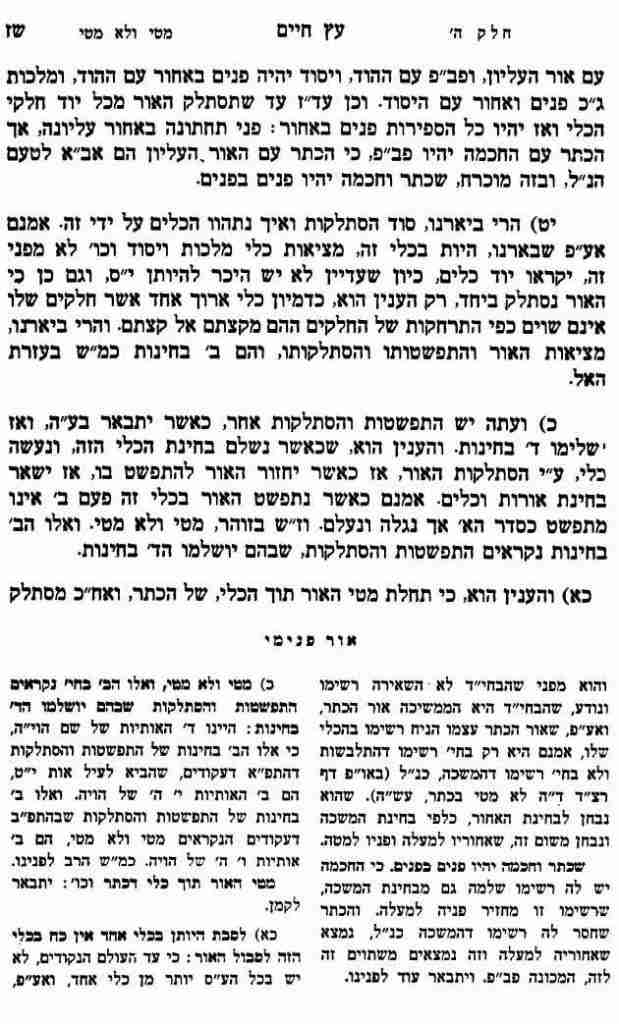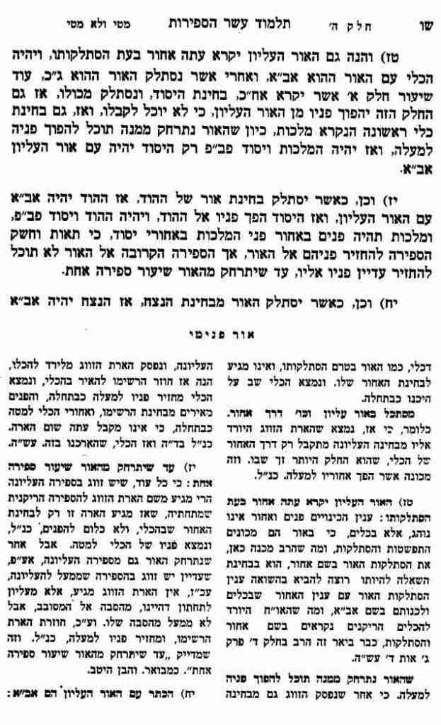 יח) וכן, כאשר יסתלק האור מבחינת הנצח, אז הנצח יהיה אב"א עם אור העליון, ופב"פ עם ההוד, ויסוד יהיה פנים באחור עם ההוד, ומלכות ג"כ פנים ואחור עם היסוד. וכן עד"ז עד שתסתלק האור מכל יוד חלקי הכלי ואז יהיו כל הספירות פנים באחור: פני תחתונה באחור עליונה, אך הכתר עם החכמה יהיו פב"פ, כי הכתר עם האור העליון הם אב"א לטעם הנ"ל, ובזה מוכרח, שכתר וחכמה יהיו פנים בפנים.