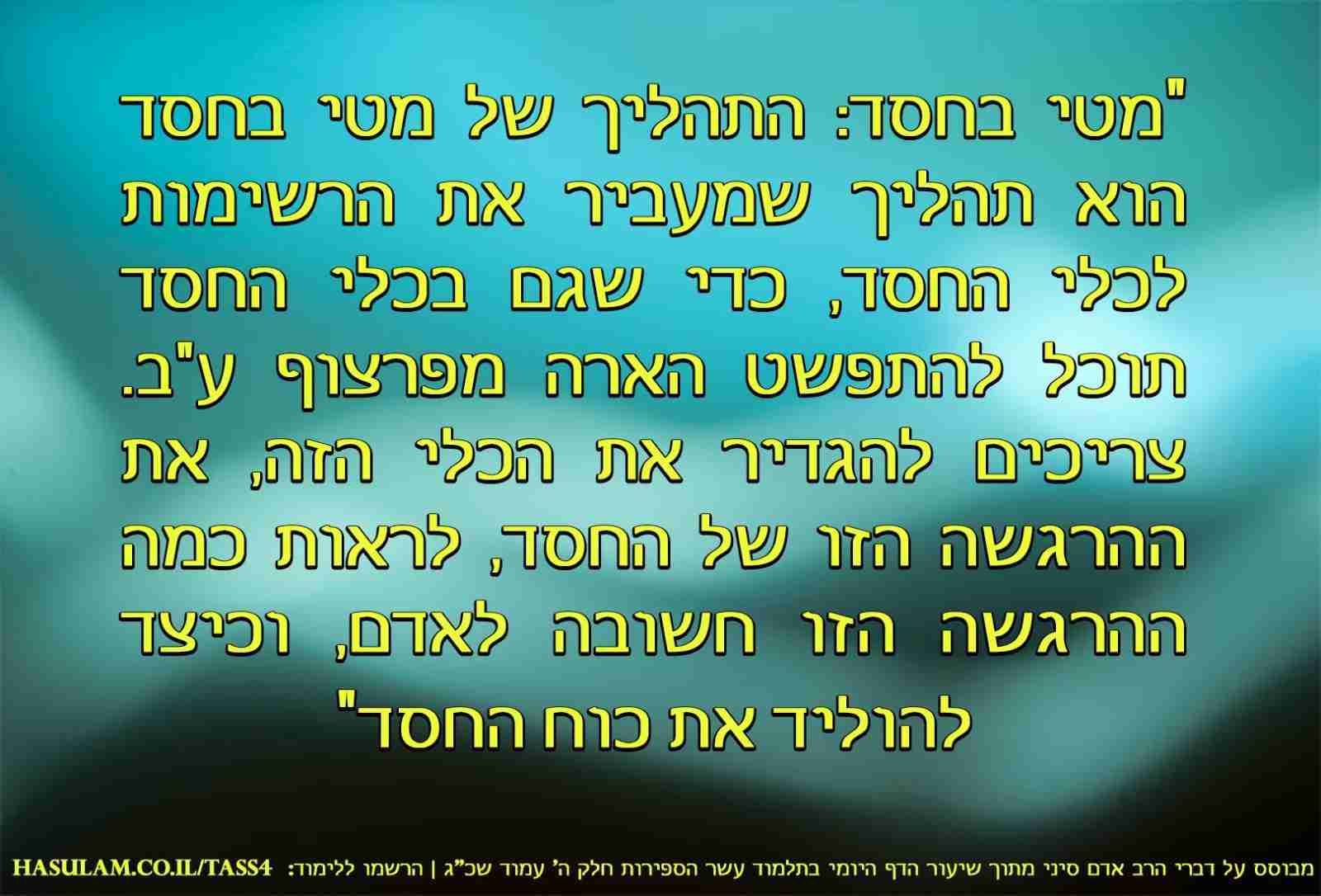 ברגע שיצאתי לעבודה, להרגיש את הרצונות שלי בקדושה, מרגיש אותם במטי ולא מטי, וכשע"ב בא למלא את הכלים הריקנים של גלגלתא, ולכן, בגלל שלא יכול לקבל את האור הגדול בד' ויצאתי לעבודה לקבל חלקית, אז בעבודה מקבל אור של ו"ק שנקרא חסדים.