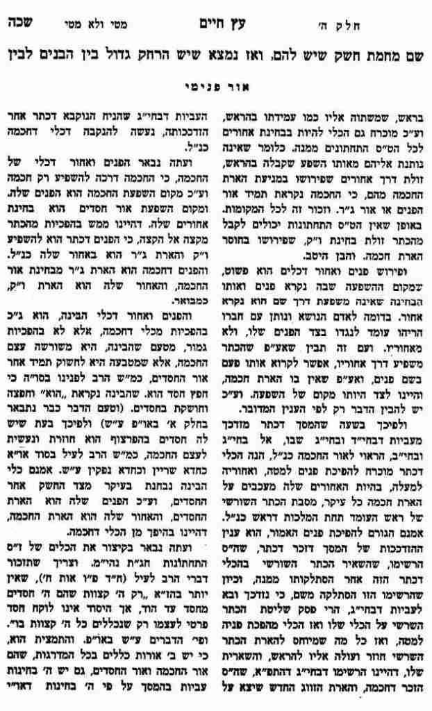ועתה נבאר הפנים ואחור דכלי של החכמה, כי החכמה דרכה להשפיע רק חכמה וע"כ מקום השפעת החכמה הוא הפנים שלה. ומקום השפעת אור חסדים הוא בחינת אחורים שלה. דהיינו ממש בהפכיות מהכתר מקצה אל הקצה, כי הפנים דכתר הוא להשפיע ו"ק והארת ג"ר הוא באחור שלה כנ"ל. והפנים דחכמה הוא הארת ג"ר מבחינת אור החכמה, והאחור שלה הוא הארת ו"ק, כמבואר.