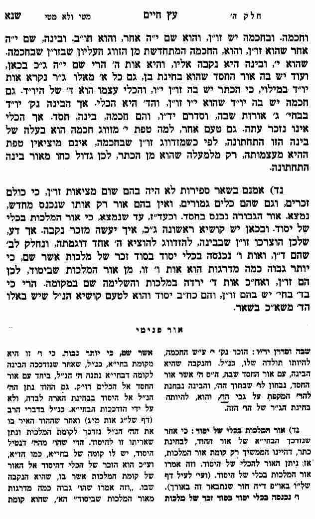 נא) וכן הענין ג"כ בבינה, רק שיש בה הפרש, והוא שנשאר בה אור הבינה מועט בעת הסתלקות כנ"ל, ועתה נכנם בה אור החסד. והנה חסד בן הבינה כנודע, ולא יתכן שיהיה הוא הזכר ואור הבינה עצמה נקבה אליו. ואם נאמר שאור הבינה יהיה זכר ואור החסד יהיה נקבה, גם זה לא יתכן. ולזה צריך אותו הפיכת פב"פ, שביארנו למעלה שהופכת חכמה פניה למטה, בעת שניתנין אליה הח' אורות, ואז מזדווגים שם במקומן זכר ונקבה של חכמה, ומוציאין ע"י זווגם אור אחד הנקרא יו"ד, ואז ניתן למטה בהפיכת פניהם לבינה, ואז אותו היוד מתלבש תוך אור הבינה ע"ד האחרות, ונעשה הי' זכר. והבינה נוקבא. ואח"כ כאשר ניתנו הז' אורות בכלי של בינה, אז ניתן בה אור של החסד, ונשאר בה אור החסד תמיד בבחי' מ"ן.