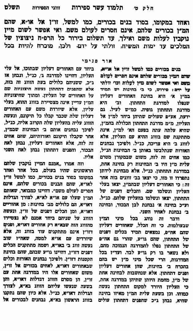 קודם כל נדע, מעלה אותך לעלי עליון, מקום שאין לך בו שום השגה, שום תפיסה, שום נגיעה, מעלה אותך למקום שאתה אף פעם לא תשיג. זה סוג של רעיון מופשט שאתה לא מצטייר שם, אין לך בו שום קיום. אז אומר בעלי עליון אתה לא מצטייר בכלל. הביקוש שלך לא מצטייר אבל אתה צריך להסכים לעלות איתו. למה? כי אם אתה מסכים לעלות איתו, שם בעלי עליון נקראים אחים בכורים. למה? כי כתוב בכור מקבל פי שתיים. הוא מקבל גם בשבילך את האור כדי שאחר כך הוא מקבל גם בשביל עצמו, הוא נהיה גדול, כשאתה בא ואתה בוכה לו "כואב לי". אז הוא מתחיל לחשוב יחד איתך, אבל תסכים שיעלה אותך. תסכים לעלות לרעיון שאתה לא מכיר. שאתה לא יודע. אבל אתה צריך להוריד מגאוותך, צריך להתמסר אליו. וזה נקרא אחים בכורים. שהתחתון שזה אח"פ וגלגלתא ועיניים, הם מאוחים, הם יחד. אז כמובן גם העליון צריך לתת לו הרגשה שהוא איתו. הוא צריך לראות שהחיסרון שלו, הוא מצוי גם עם זה שהוא רוצה לתקן מישהו אחר. אם הוא לא רוצה לתקן מישהו אחר, אין לו את מידת ההשפעה הזו, של הרצון לחנך, של הרצון לגדול. הוא לא יכול להעלות אותו לעלי עליון. אז בגלל שהאח"פ של העליון טמונים בגלגלתא ועיניים של התחתון, מצד הרשימות, ואחר כך זה מתקיים תמיד. למה תמיד? כי לא גמרנו את הרשימות עד שלא נהינו מתוקנים לגמרי. אז נגיד העלתי את האח"פ ואמרתי אני רוצה להיות גדול. עליתי לעליון שלי רציתי להיות גדול, העליתי גם את הגלגלתא ועיניים דתחתון, אז הוא אומר- "אין אשה מתעברת מביאה ראשונה". הגלגלתא ועיניים לא מצטיירים בעלי עליון. מה מצטייר בעלי עליון, האח"פ שנקרא כלי המעלה מ"ן, מיהו המ"ן? זה הביקוש של התחתון. הוא עוד לא קיים, הוא רוצה להיות קיים. הוא נמצא באיזשהו כאוס, באיזשהי נפילה, אז אני מעלה אותו לעלי עליון. מה קורה בעלי עליון? אני מקבל אור בשבילי, בשביל הגדלות שלי, אני מבין את העניין, ועכשיו אני יורד למקומי, אני גדול ורק אז אני מעבר אותו אצלי. לכן בפעם הראשונה ברעיון העליון לא מתעבר. מה זה להתעבר? להצטייר. לעשות ציור. מה זה ציור? לשים את הגבולות הראויים כדי לבוא לידי ביטוי. זה לא קורה לך ברעיון המופשט, בעלי העליון, אז אתה עוד לא יודע איך לפעול. עכשיו הוא יורד למקומו, מקבל את הגדלות שלו מתחיל לצייר אותך. מתחיל לתת לך דרך: אלה הם הגבולות שבהם אתה נוהג, ככה אתה צריך לעשות. ואם אתה מזייף מאחרי הגב ואינך עומד בגבולות, אתה תתפרק. אתה חייב לעמוד בגבולות כמו שנתנו לנו תורה. ככה מציירים את הוולד בעובר. אומרים לו- זה יד, זה רגל. אבל אתה רואה רק שהוא נהיה מוטציה. אתה רוצה להוליד אותו כאדם והוא רוצה לעשות רק מה שהוא רוצה, נולד כעז. נולד כעורב. אדם, אבל בהתנהגות של עורב או עז.